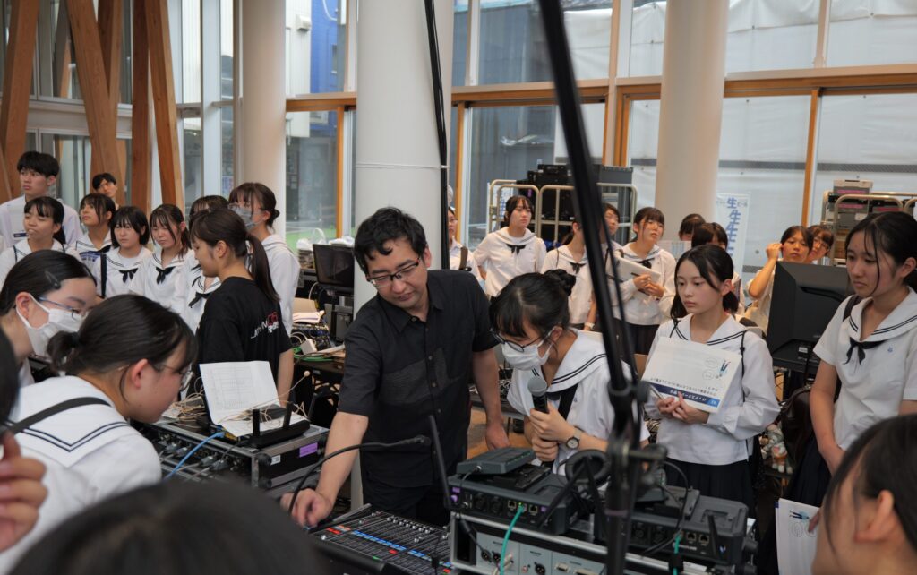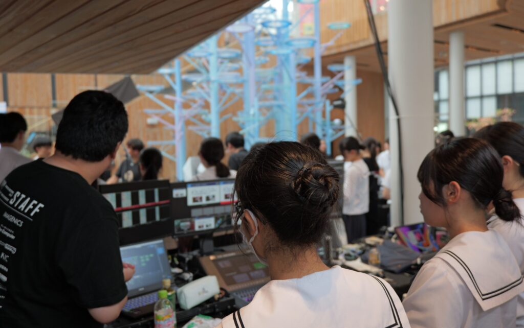 イベントの前日には、公立高校で唯一「表現科」を有し、演劇・ダンス・音楽など舞台芸術を専門的に学べる青森県立八戸東高等学校の生徒を対象に、特別な学習プログラムを実施しました。実際のイベントで使用する機材に触れながら、音響・照明・映像の各オペレーション業務を紹介し、イベントがどのように作られていくのかを授業の一環として体験いただきました。