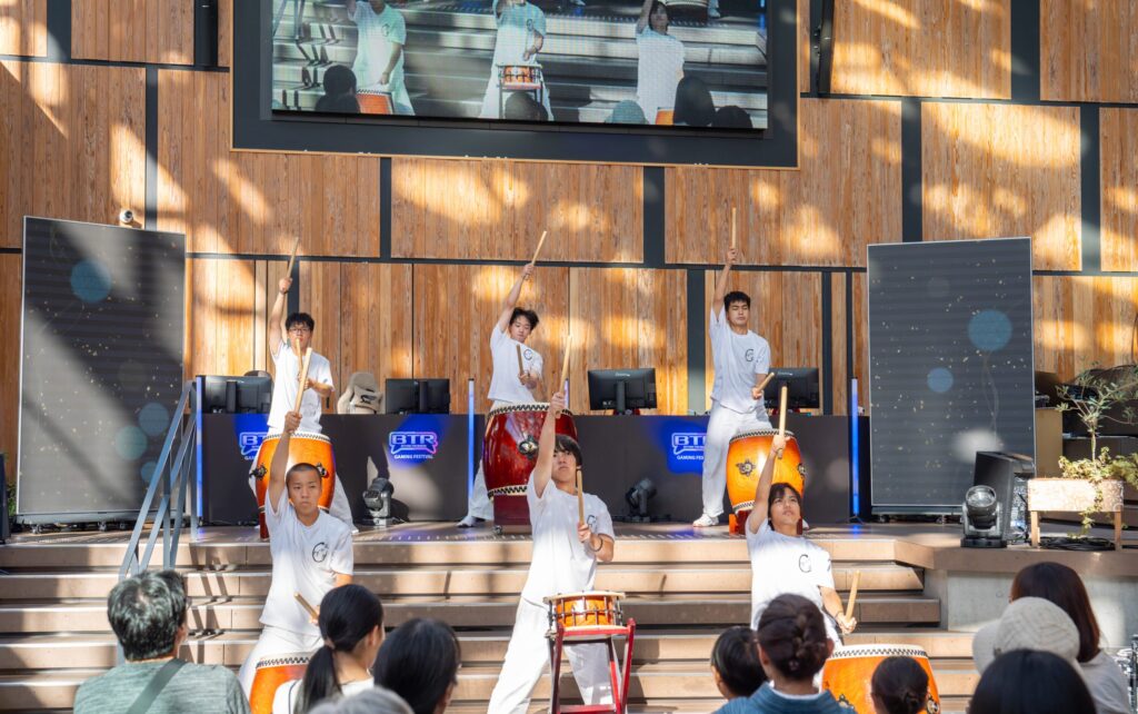 続いてステージに登場したのは、八戸向陵高等学校太鼓部。力強く迫力ある和太鼓の演奏がマチニワの広場全体に響き渡り、地域文化とゲームイベントが融合する特別な瞬間を演出。観客の皆さんもその迫力に引き込まれていました。