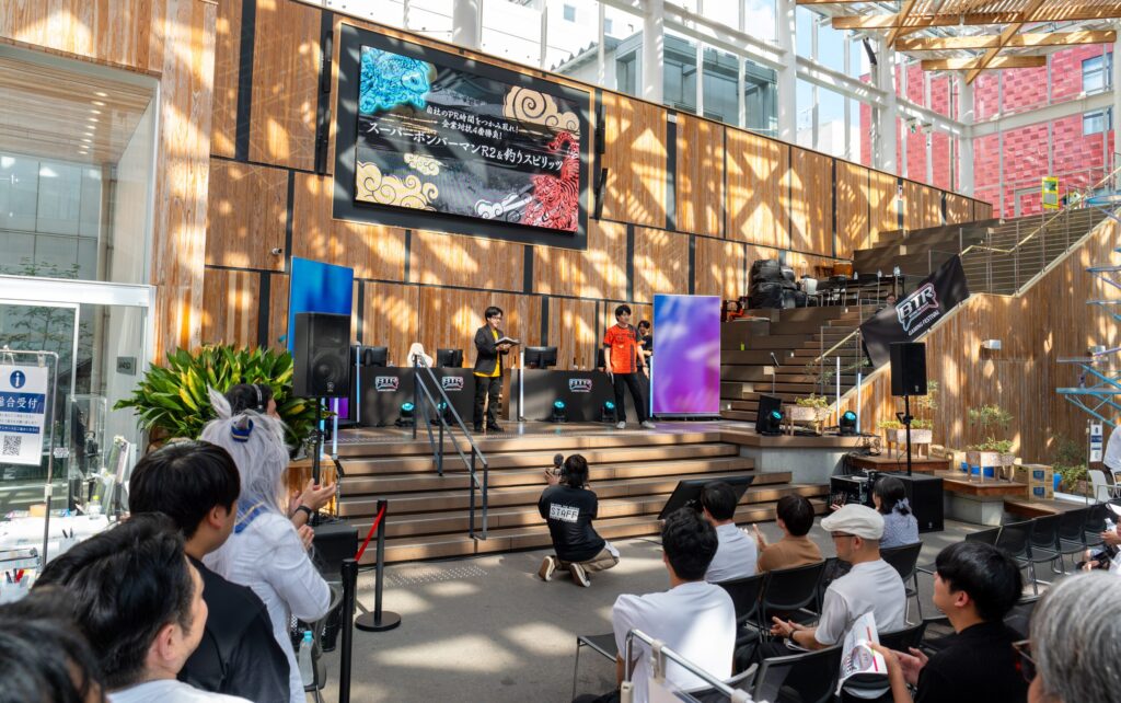 企業対抗戦では、参加企業の代表者が「釣りスピリッツ 釣って遊べる水族館 」と「スーパーボンバーマン R 2」で熱いバトルを展開。会社の名を背負いながらも、いつもとは違うリラックスした姿で対戦する様子に、会場は笑いと歓声に包まれました。